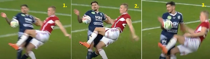Már a vezető (és később győztes) góljuk is minimum véleményes volt: az egész akciójuk abból indult, hogy Yougát hátulról kilökik a labda elől a saját térfelükön. A gólt vissza se nézték, hamar jóvá hagyták, de ezt még el is tudtam volna fogadni. Az ilyen kontaktok beleférnek, persze csak akkor, ha következetesen vannak kezelve, de Magyarországon ez nem így van. Nem csak játékvezetőktől függ, hogy ki mennyire engedi a kemény játékot, hanem még ugyanazon bíró is másként ítél meg egy mérkőzésen belül hasonló szituációkat.
